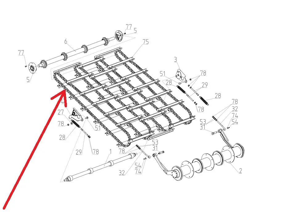 Oryginalny łańcuch przenośnika pochyłego o wymiarach 38 x 107 rolek, 26 zabieraków i numerze katalogowym 101464765, stosowany w kombajnach zbożowych marki Rostselmash.