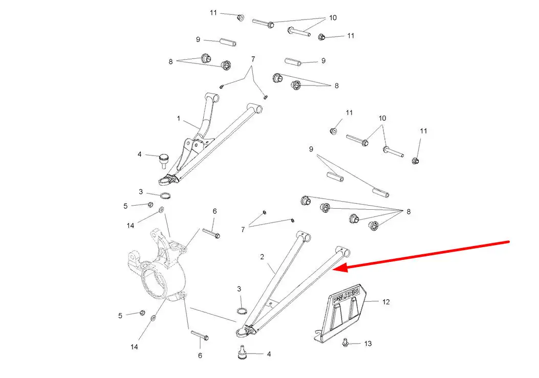 Oryginalny, lewy wahacz dolny przedniego koła, stosowany w maszynach rolniczych marki Polaris.