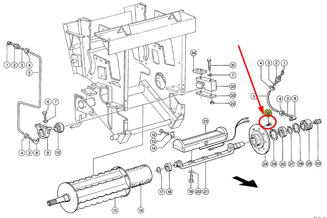 Oryginalna śruba imbusowa z łbem płaskim i pełnym gwintem o wymiarach M10 x 20 mm, stosowana jako śruba mocująca dolny przedni walec transportowy w sieczkarni samojezdnej Jaguar marki Claas.