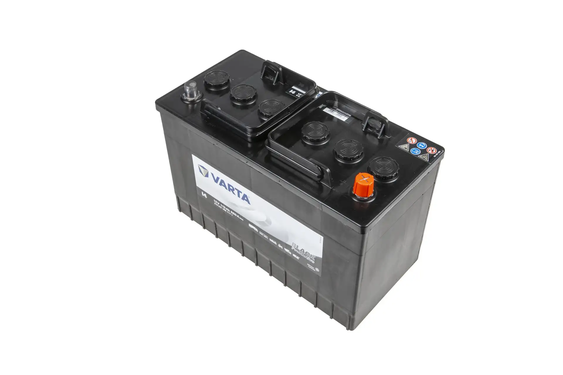 Akumulator o parametrach 12V 110Ah i numerze katalogowym 610047068A742, stosowany w maszynach rolniczych.