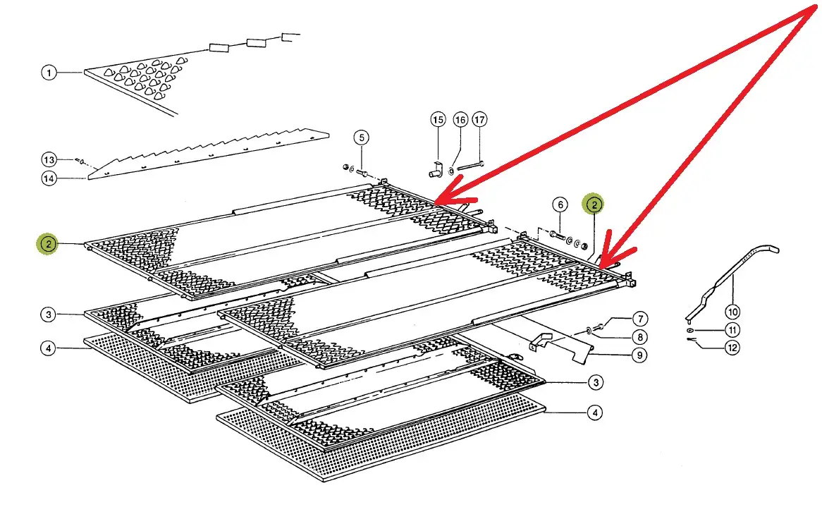 Sito żaluzjowe górne o wymiarach 694 x 1739 mm i numerze katalogowym 647127.Z001P, stosowane w kombajnach zbożowych marki Claas.