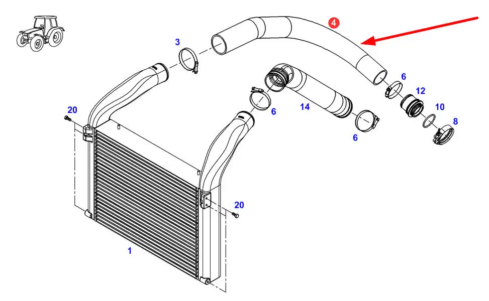 Oryginalny przewód chłodnicy powietrza doładowującego o numerze katalogowym 835200190050, stosowany w ciągnikach rolniczych marki Fendt.