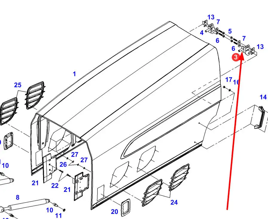 Oryginalny uchwyt maski silnika o numerze katalogowym H725500020721, stosowany w ciągnikach rolniczych marki Fendt.