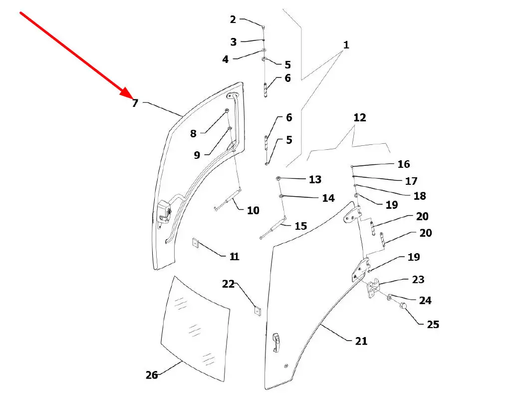 Oryginalna szyba drzwi prawych o numerze katalogowym L000482, stosowane w ciągnikach rolniczych marek Arbos oraz Lovol.