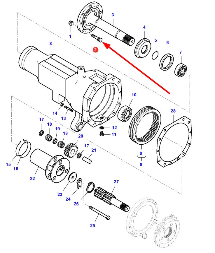 Oryginalna śruba przedniej osi o wymiarach M20 X 1,5mm i numerze katalogowym V31796200, stosowany w ciągnikach rolniczych marek Valtra oraz Massey Ferguson.